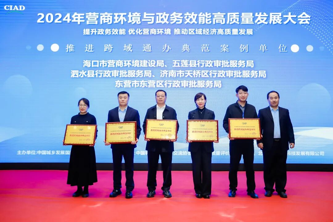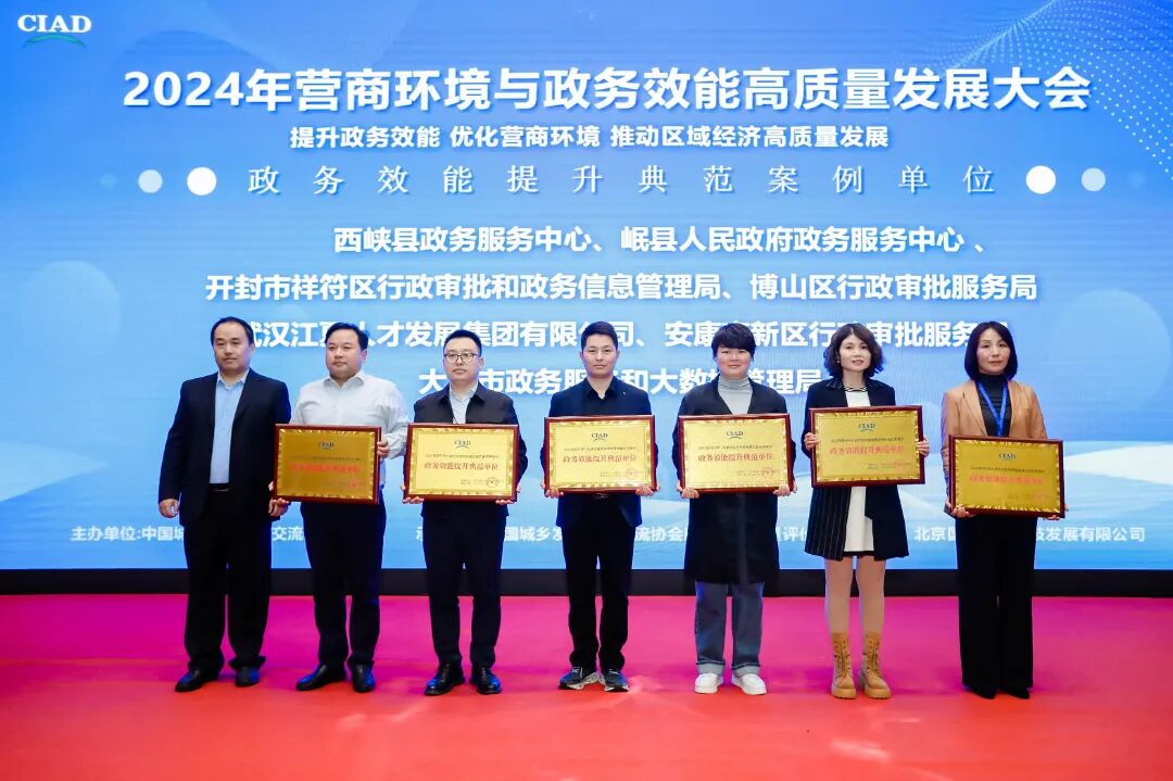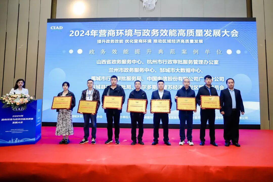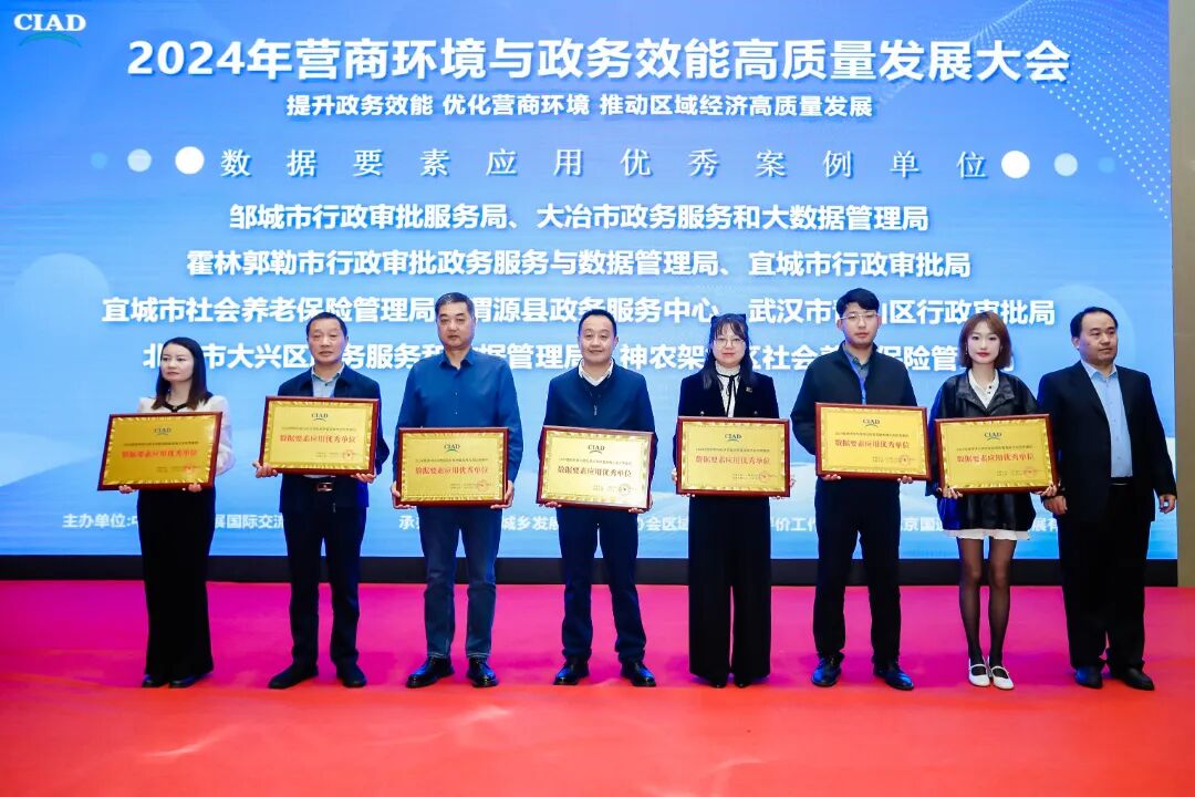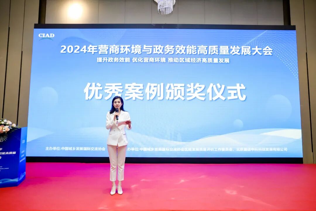 ![]() 本次大会由中国城乡发展国际交流协会主办,中国城乡发展国际交流协会区域发展质量评价工作委员会、北京国道中科科技发展有限公司承办。大会为持续提升政务服务效能 助力创新政府治理和优化营商环境,政务服务从“能办”向“好办”转变,不断加快政务服务提档升级、提质增效,及时总结行之有效的经验做法。面向全国范围内省、市、区、县各委、办、局,经济发展及营商环境、政务服务、行政审批、数字管理相关单位、企业、机构征集优秀案例,收到了社会各界广泛关注与积极参与。截止到2024年9月30日,经过近半年动员、申报、资料复查、公示、网络投票、专家评审和综合评分,征集案例800余篇,经过严格的遴选,大会组委会与2024年10月17日在北京公布了获奖优秀单位名单。 大会针对“2024营商环境与政务效能高质量发展”优秀案例,精心设置了优化营商环境创新案例单位、政务服务品牌影响力案例单位、政务效能提升典范案例单位、政务增值服务典范案例单位、数据要素应用优秀案例单位、推进跨域通办典范单位、区域经济发展创新案例单位共7类奖项,并举行了隆重的现场颁奖仪式。