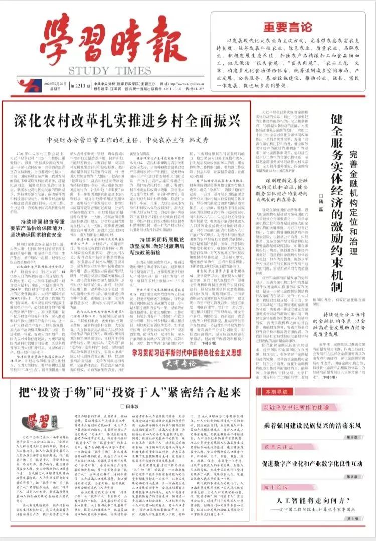 中央财办分管日常工作的副主任、中央农办主任 韩文秀 2024年中央农村工作会议上,习近平总书记对“三农”工作作出重要指示,强调“坚持城乡融合发展,进一步深化农村改革,完善强农惠农富农支持制度,全面推进乡村振兴”。当前,国际环境复杂严峻,我国发展面临的不确定难预料因素增多,越是风高浪急,越要稳住农业农村基本盘,落实农业农村优先发展的战略要求,坚持城乡融合发展,向改革开放和科技创新要动力,聚焦乡村全面振兴和建设农业强国目标,扎实工作、奋力进取,为实现中国式现代化保驾护航。 持续增强粮食等重要农产品供给保障能力,坚决确保国家粮食安全
