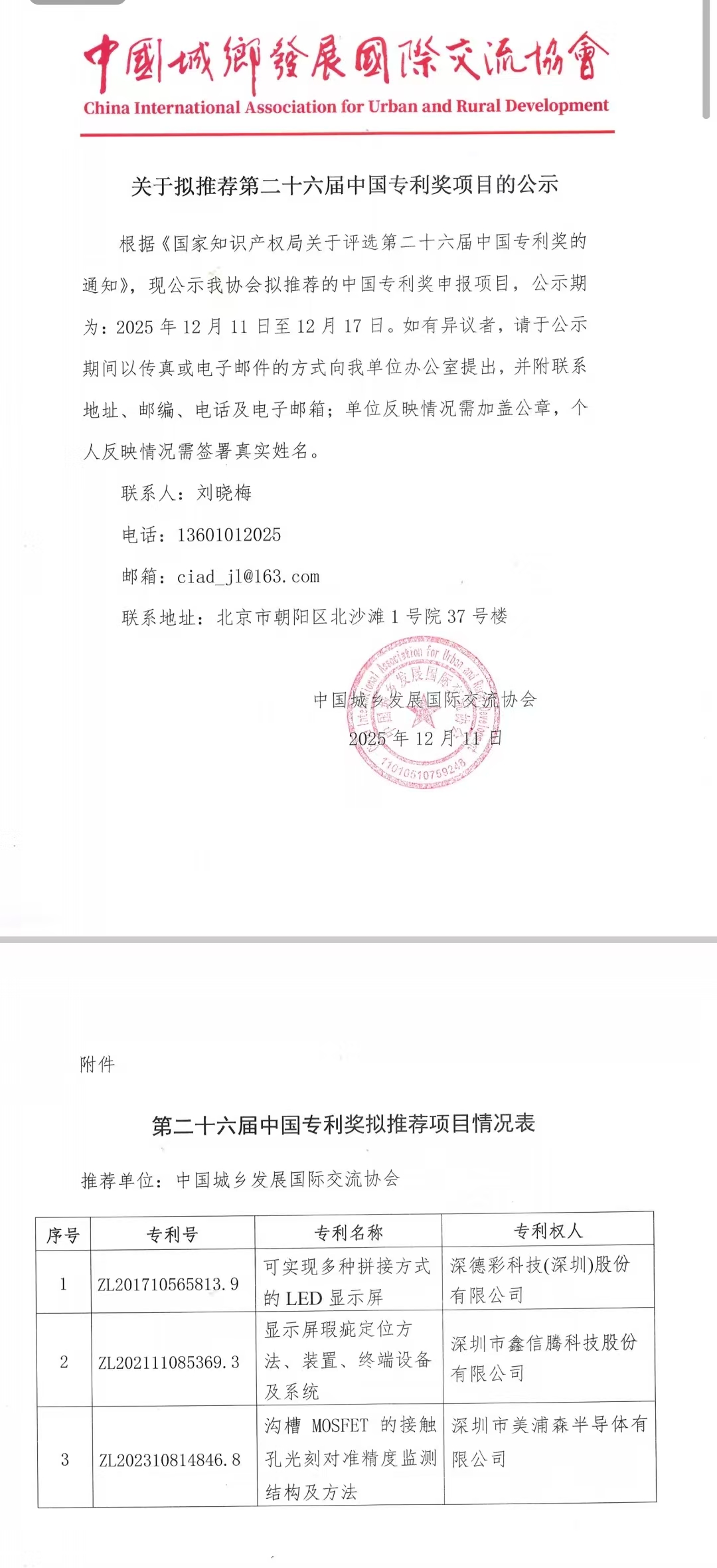 关于拟推荐第二十六届中国专利奖项目的公示发表时间:2025-12-11 14:11 关于拟推荐第二十六届中国专利奖项目的公示 根据《国家知识产权局关于评选第二十六届中国专利奖的通知》,现公示我协会拟推荐的中国专利奖申报项目,公示期为:2025年12月11日至12月17日。如有异议者,请于公示 期间以传真或电子邮件的方式向我单位办公室提出,并附联系地址,邮编,电话及电子邮箱;单位反映情况需加盖公章,个人反映情况需签署真实姓名。 联系人:刘晓梅 电话:13601012025 邮箱:ciad_jl@163.com 联系地址:北京市朝阳区北沙滩1号院37号楼 中国城乡发展国际交流协会 2025年12月11日