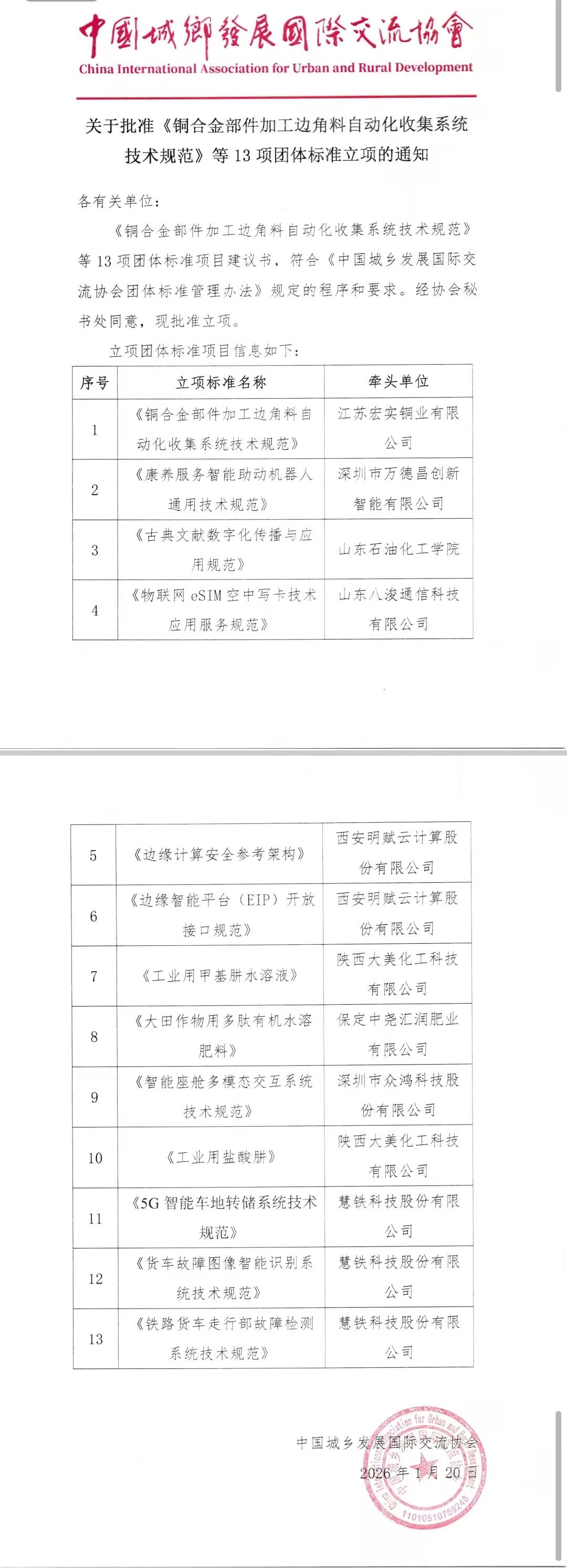 《铜合金部件加工边角料自动化收集系统技术规范》等13项团体标准项目建议书,符合《中国城乡发展国际交流协会团体标准管理办法》规定的程序和要求。经协会秘书处同意,现批准立项。